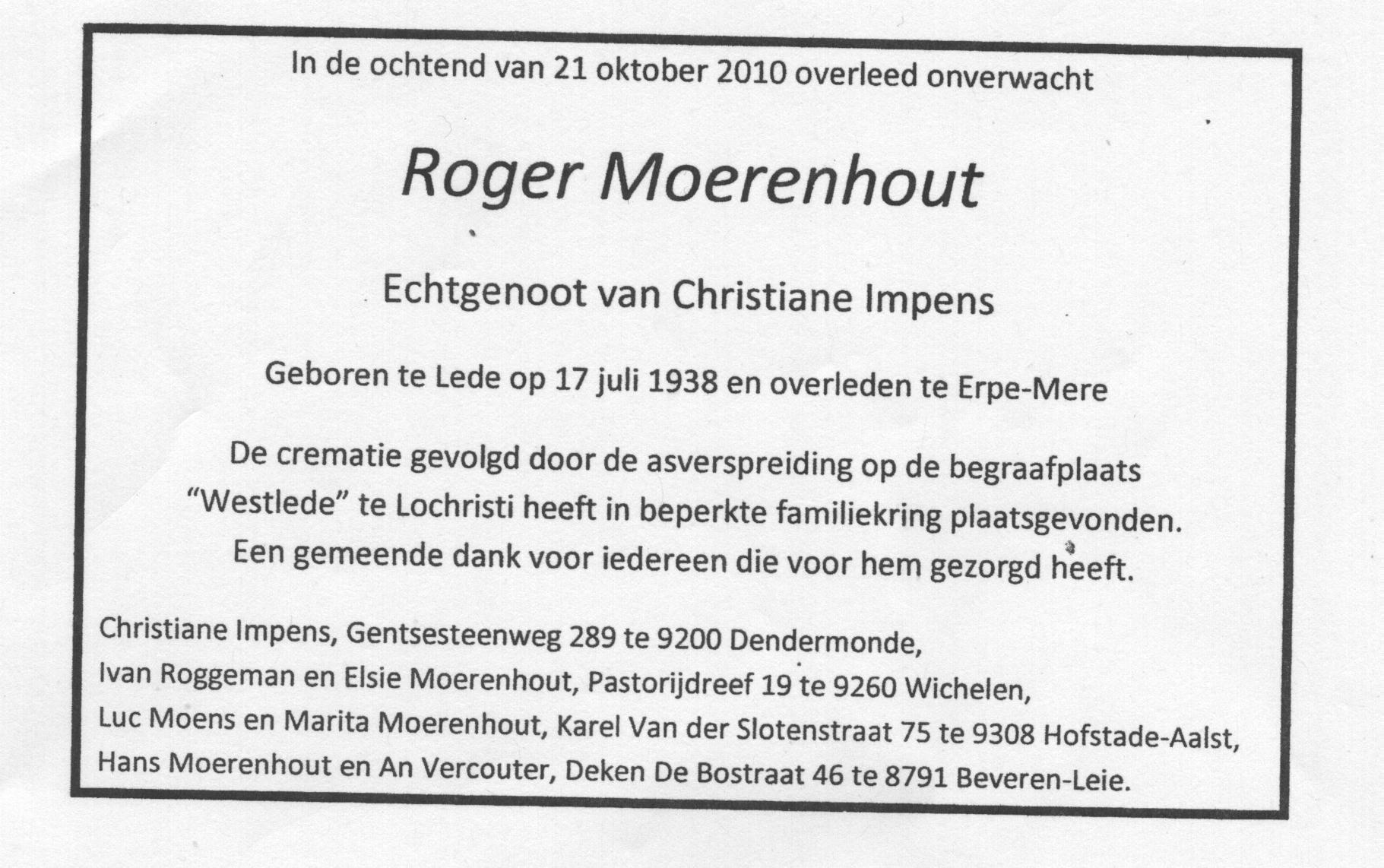 Roger Moerenhout Birth: July 17, 1938 29 27 — Lede Death: October 21, 2010 — Erpe-Mere |