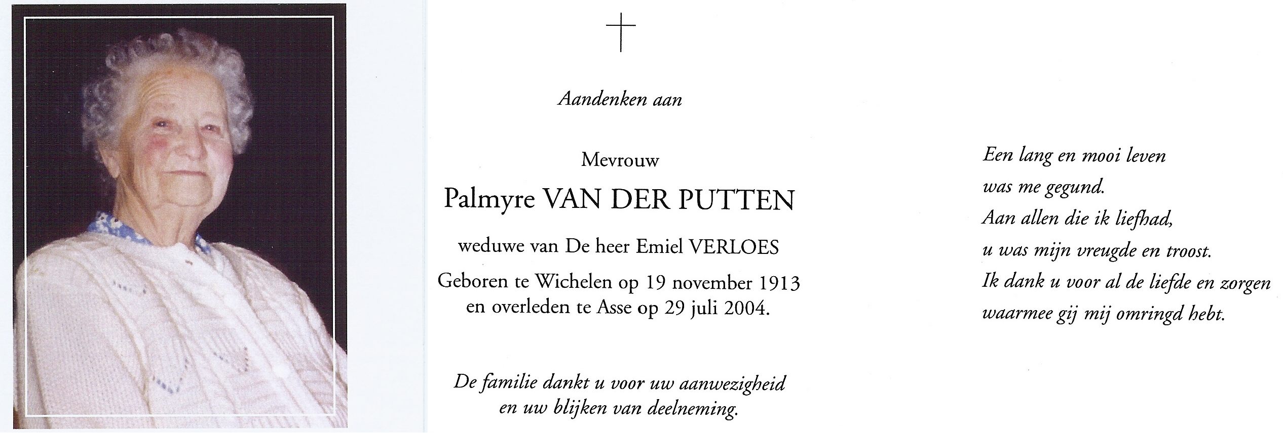 | Palmyre Van der Putten | 19 november 1913 | 112 | Wichelen | 1 | 29 juli 2004 | 21 | 90 | Asse | 14 augustus 2014 - 08:32:00 | F | YES | Y100 | ||||