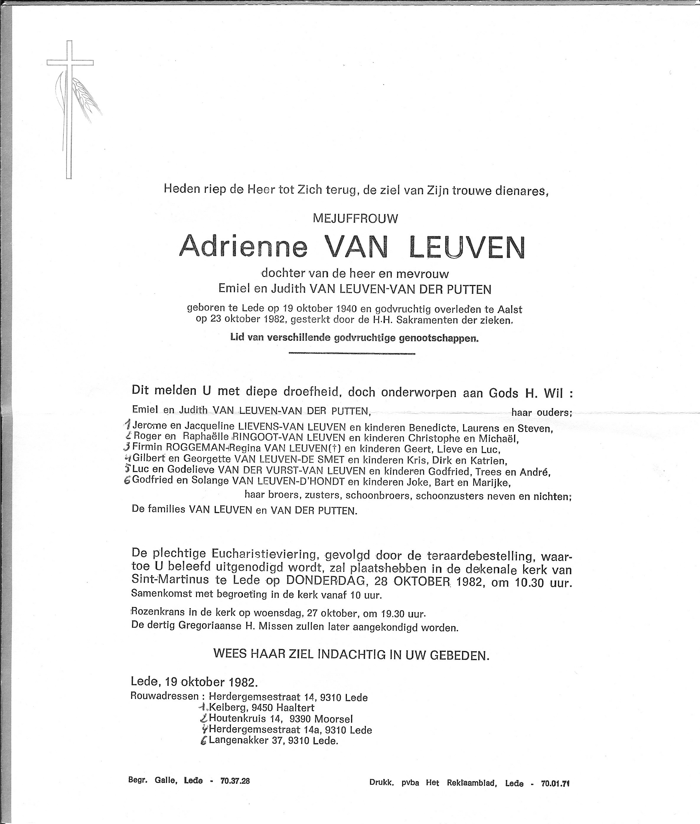 | Adriënne Van Leuven | 19 oktober 1940 | 85 | Lede | 0 | 23 oktober 1982 | 43 | 42 | Aalst | 29 september 2008 - 19:34:00 | F | Y100 | Y100 | ||||