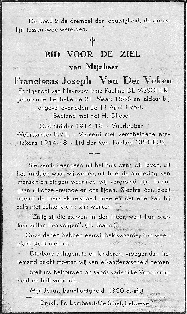 | Franciscus Joseph Van Der Veken | 31 maart 1886 | 139 | Lebbeke | 11 | 11 april 1954 | 71 | 68 | Lebbeke | 30 juli 2008 - 23:02:00 | M | YES | Y100 | R | |||