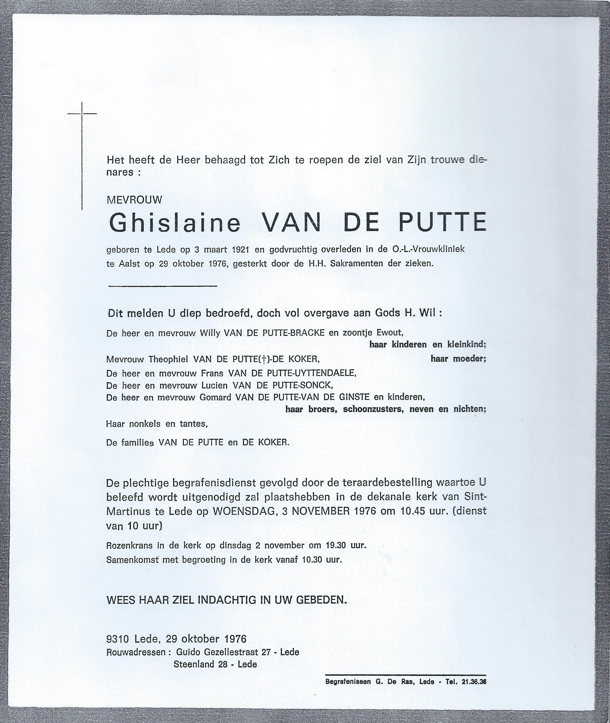 | Ghislaine Van de Putte | 3 maart 1921 | 104 | Lede | 1 | 29 oktober 1976 | 49 | 55 | Aalst | 27 februari 2016 - 21:41:00 | F | YES | Y100 | ||||