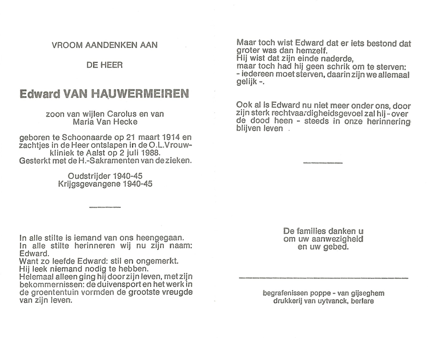 | Eduardus Van Hauwermeiren | 21 maart 1914 | 111 | Schoonaarde | 0 | 2 juli 1988 | 37 | 74 | Aalst | 18 oktober 2009 - 14:58:00 | M | YES | Y100 | ||||