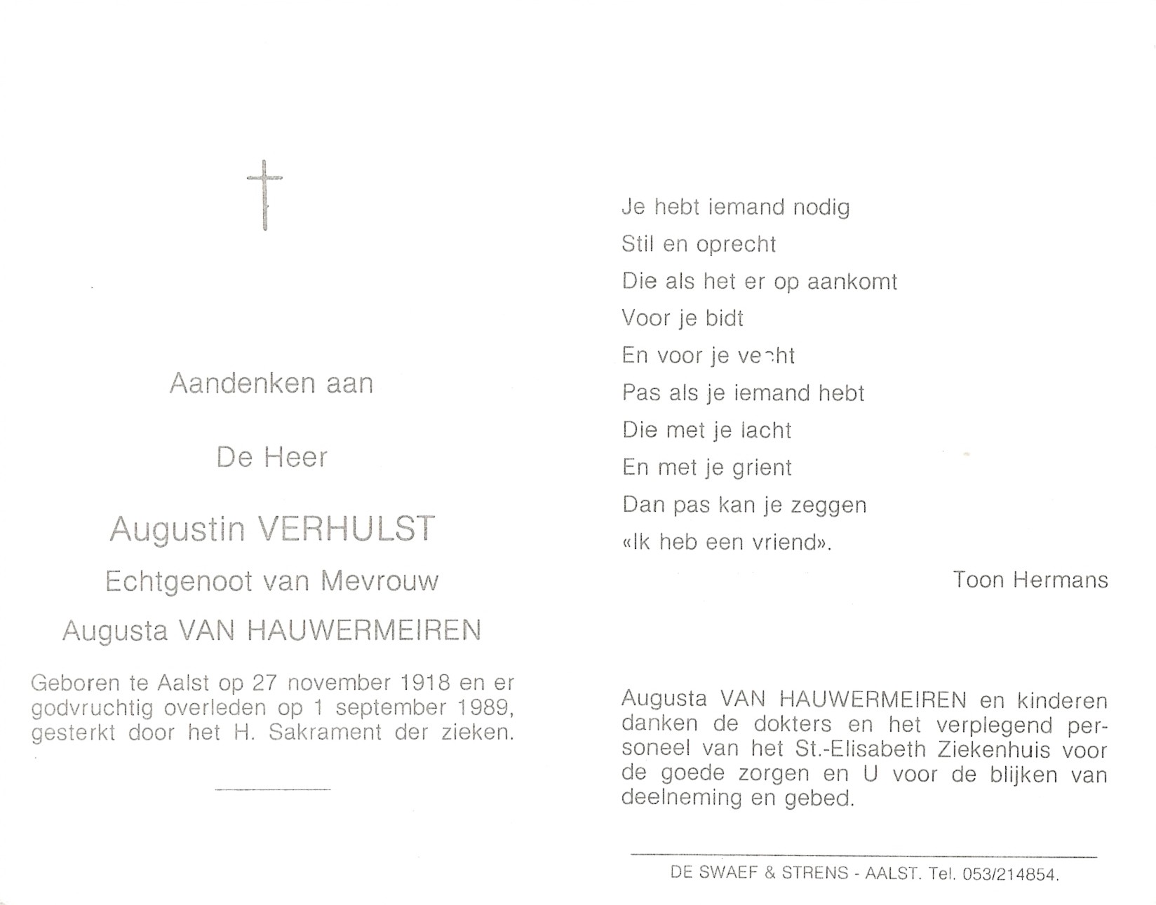 | Augustin Verhulst | 27 november 1918 | 107 | Aalst | 1 | 1 september 1989 | 36 | 70 | Aalst | 30 juli 2008 - 23:22:00 | M | YES | Y100 | R | |||