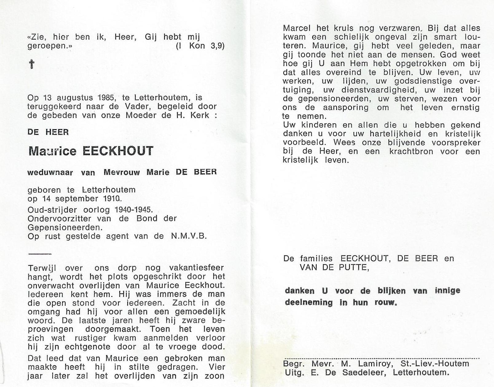 | Maurice Eeckhout | 14 september 1910 | 115 | Letterhoutem | 2 | 13 augustus 1985 | 40 | 74 | Letterhoutem | 16 augustus 2014 - 23:50:00 | M | YES | Y100 | ||||