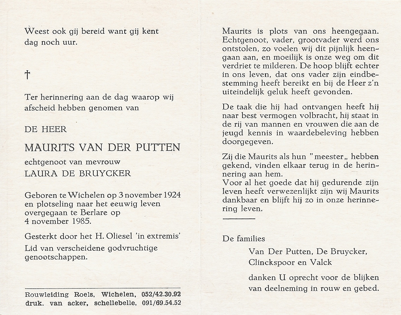 | Maurits Domien Van der Putten | 3 november 1924 | 101 | Wichelen | 1 | 4 november 1985 | 40 | 61 | Berlare | 6 maart 2016 - 10:56:00 | M | YES | Y100 | ||||