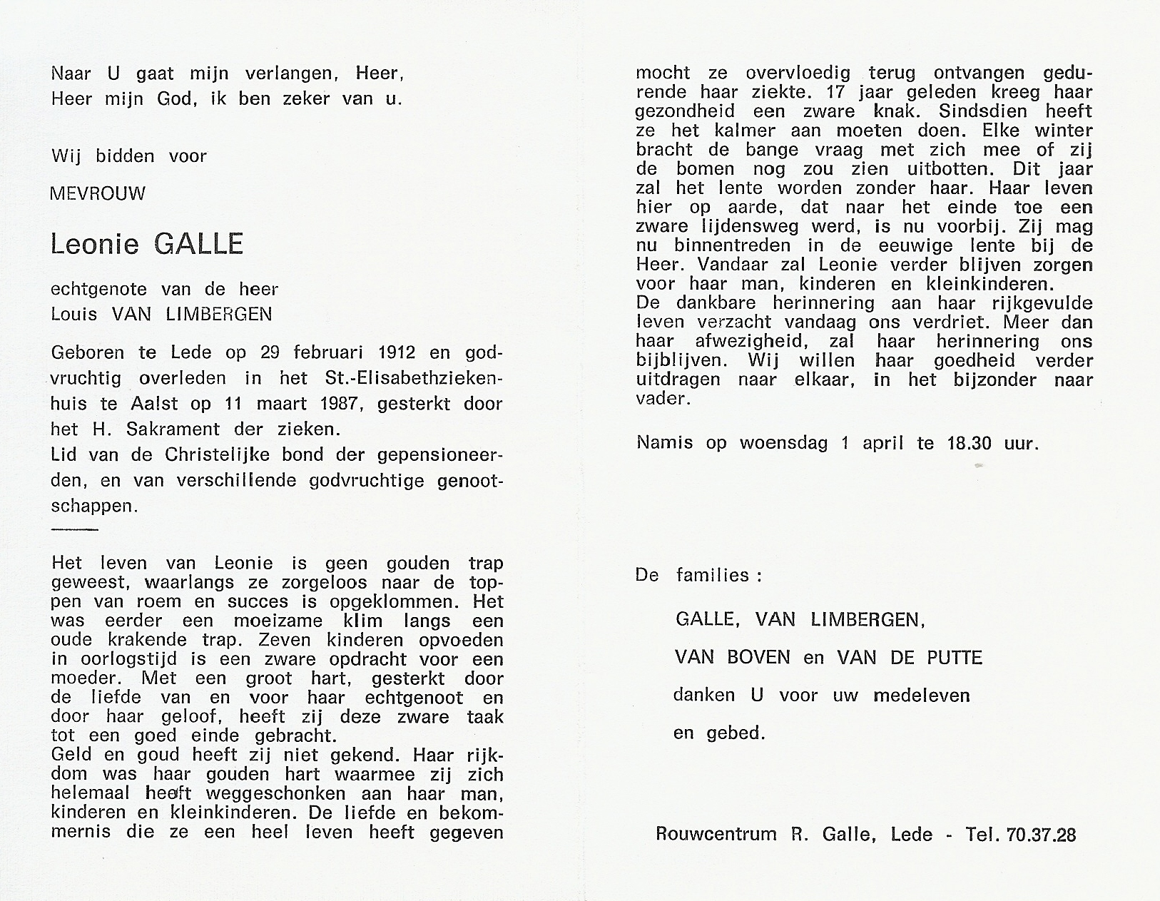 | Maria Leonia Galle | 29 februari 1912 | 114 | Lede | 7 | 11 maart 1987 | 39 | 75 | Aalst | 6 maart 2016 - 15:03:00 | F | YES | Y100 | R | |||