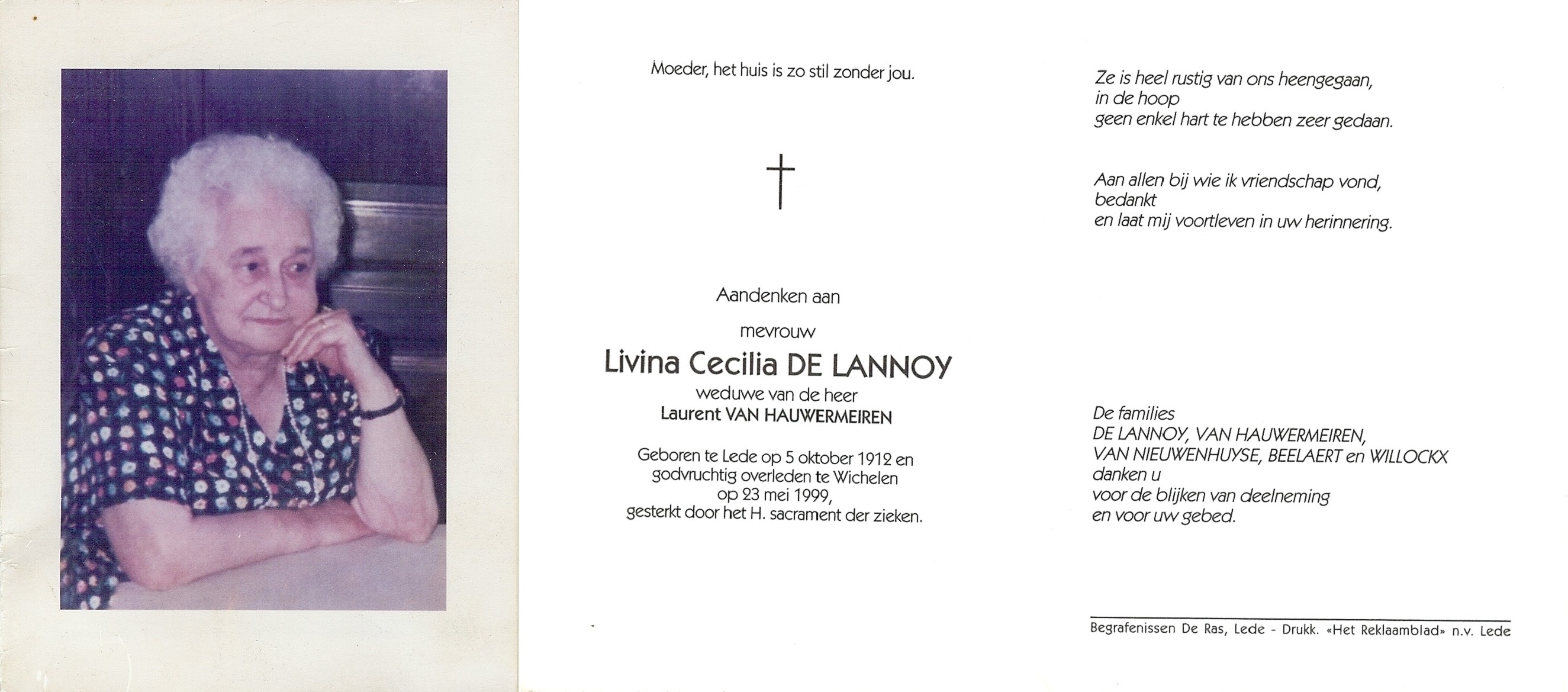 | Livina Cecilia De Lannoy | 5 oktober 1912 | 113 | Lede | 4 | 23 mei 1999 | 26 | 86 | Wichelen | 13 maart 2020 - 14:35:00 | F | YES | Y100 | R | |||