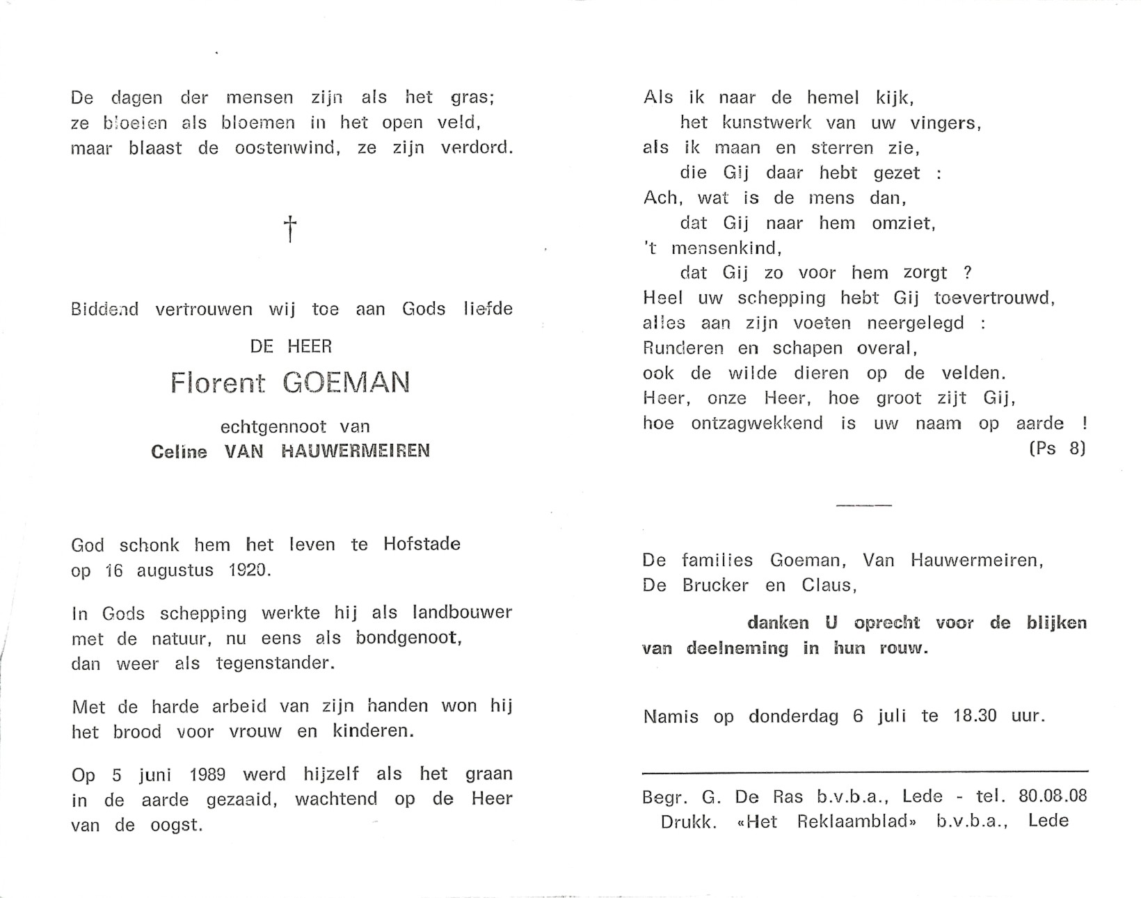 | Florent Joseph Goeman | 16 augustus 1920 | 105 | Hofstade | 2 | 5 juni 1989 | 36 | 68 | Lede | 8 maart 2020 - 18:49:00 | M | YES | Y100 | R | |||