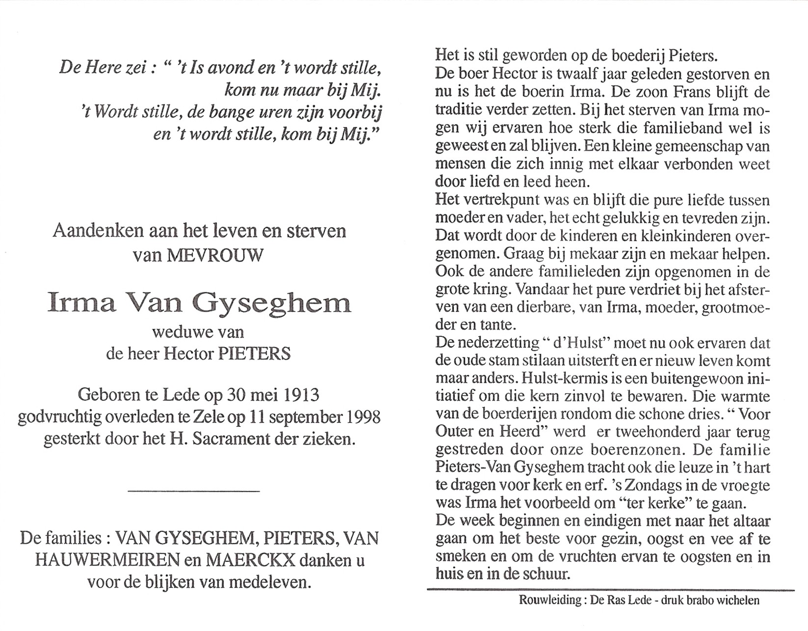 | Irma Van Gijseghem | 30 mei 1913 | 112 | Lede | 2 | 11 september 1998 | 27 | 85 | Zele | 18 oktober 2009 - 20:47:00 | F | YES | Y100 | ||||