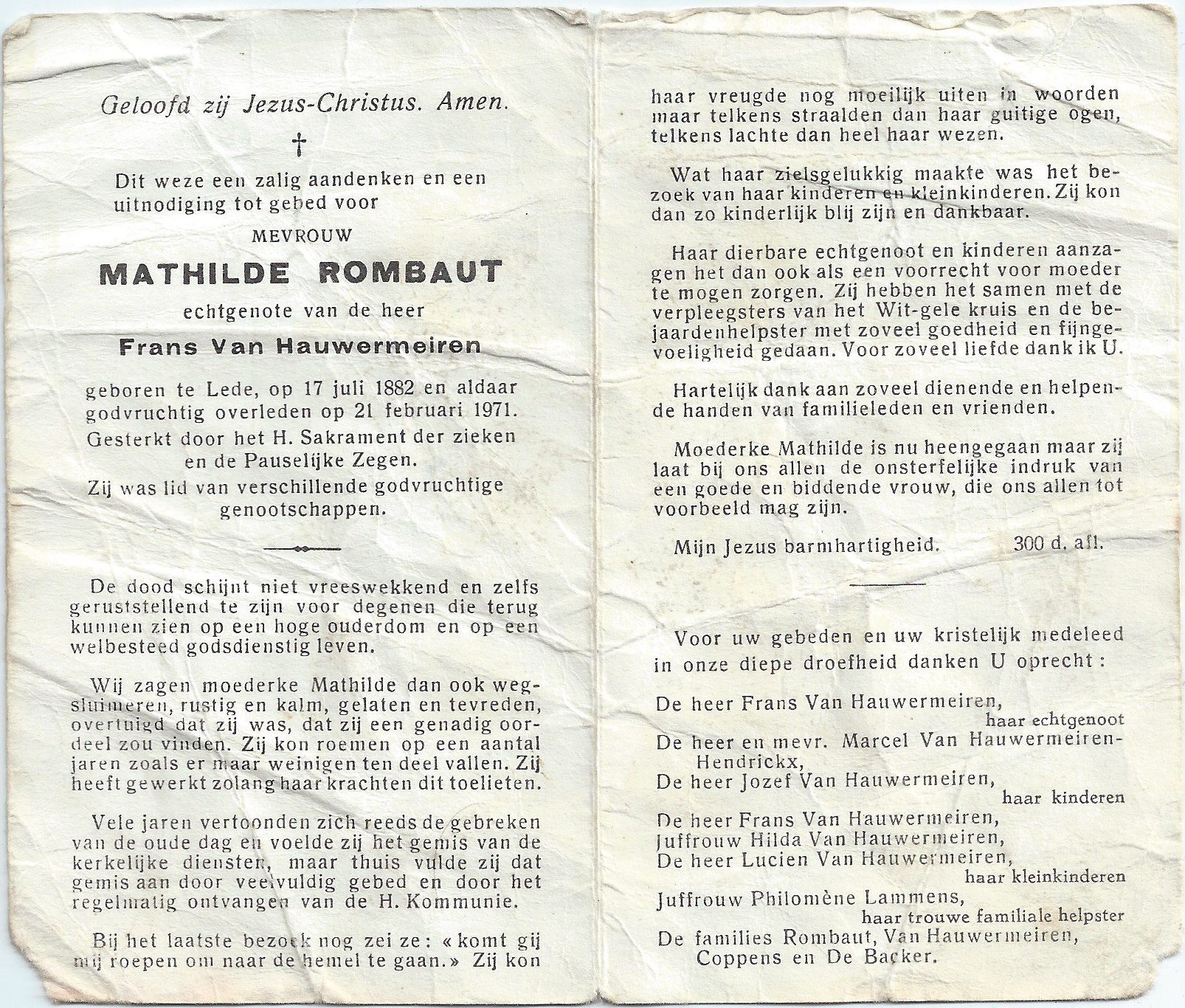 | Mathildis Rombaut | 17 juli 1882 | 143 | Lede | 2 | 21 februari 1971 | 55 | 88 | Lede | 17 augustus 2014 - 18:08:00 | F | YES | Y100 | R | |||