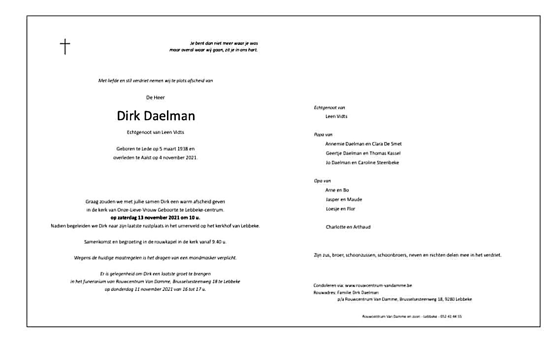| Dirk Daelman | 5 maart 1938 | 87 | Lede | 3 | 4 november 2021 | 4 | 83 | Aalst | 20 maart 2022 - 16:30:00 | M | Y100 | Y100 | ||||